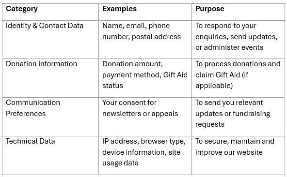 - Legitimate interest — For purposes such as fundraising, communication, or improving our services (balanced against your rights)
